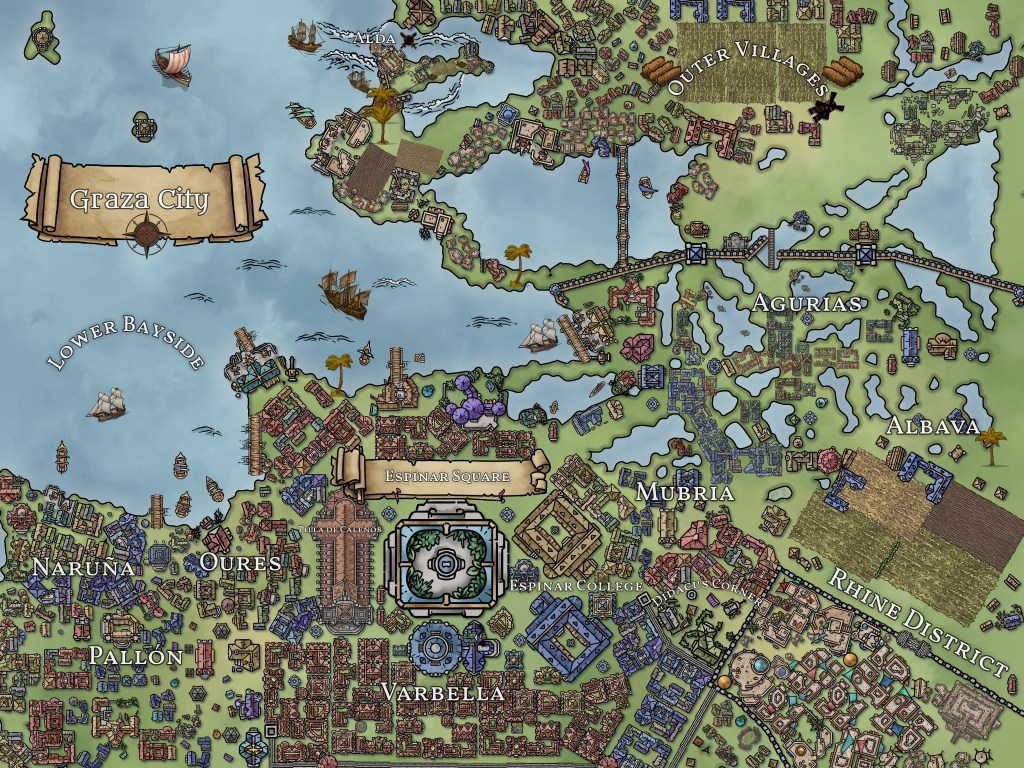 Graza City started her journey as a collection of fishing villages on the coast of a divided Escan until it was officially settled and united by King Didacus I of House Espinar. In her time since, it has become home to a unique dialect, the birth place of many different times of music and dances, the center of Escana culture, and a multicultural hotspot. A coastal city with a dense history as it sits in the shadow of what is now none as the great Graza Palace. It’s most plentiful export is considered a luxury and delicacy by the royals on the hill and thus in high demand. At the height of the Escana Empire, Graza City split into several very recognizable districts/neighborhoods that can be a bit difficult for a visitor so let’s go through them.